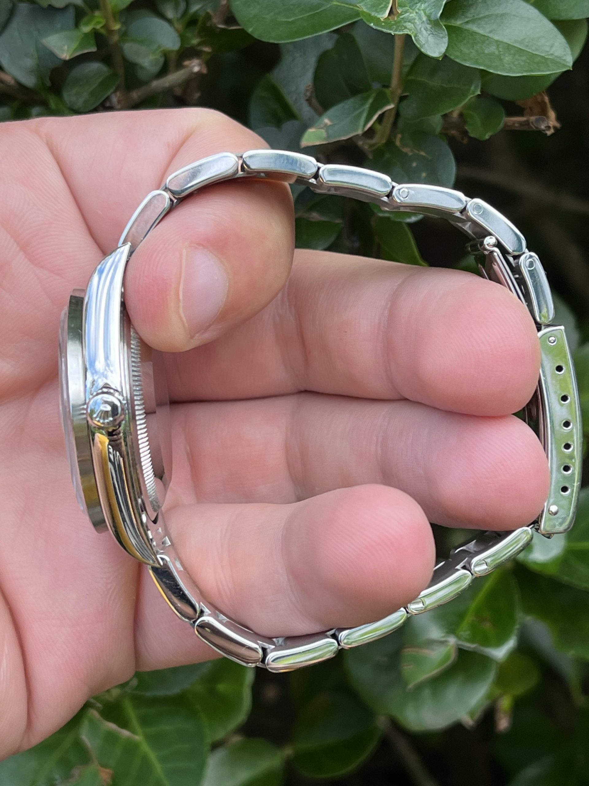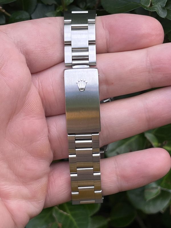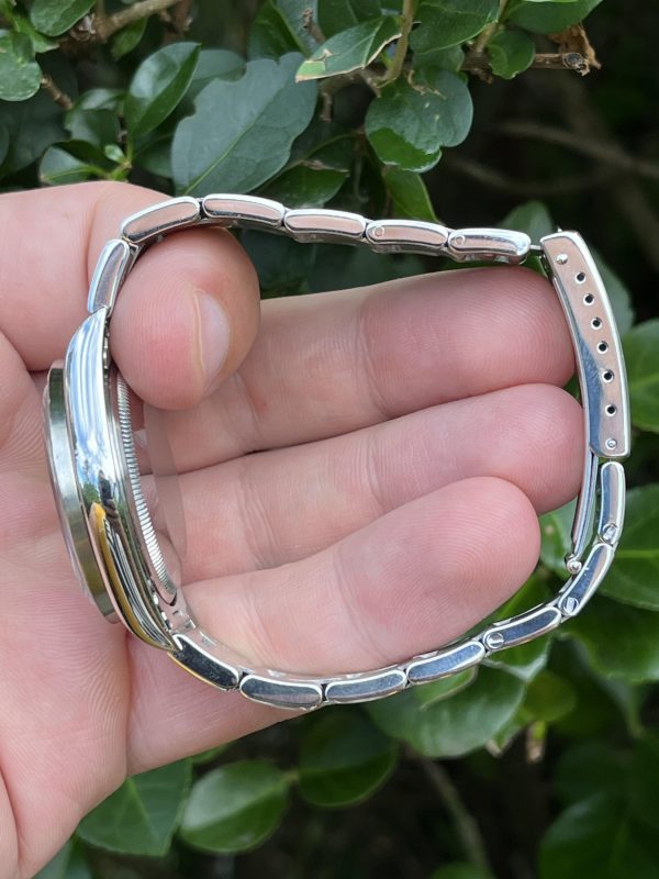 The watch is in overall excellent pre-owned condition . The bracelet is nice and tight with no scratches. The case is sharp. No dings or dents. Super Clean watch for the age. The sapphire crystal is nice and clean. Dial and hands are in excellent condition. No corrosion or spotting. Lugs are nice and sharp. The clasp is clean. Thick coronet. The steel bezel is in very good condition.